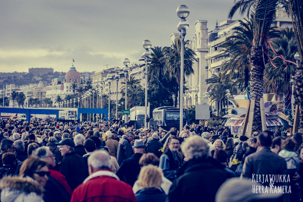 Kukkaiskulkue on vain osa kahden viikon spektaakkelia. Meiltä jäi näkemättä iltakarnevaalit Nizzan keskustassa tyystin (aikainen nukkumaanmenoaika, haa!) ja koko kahden viikon grande finale ilotulituksineen jouduttiin tänä vuonna perumaan hirmuisen kaatosateen takia. Ensi vuonna mimosanoksia viskotaan tonneittain yleisöön 10.-26.2.2017. Kannattaa kokea!